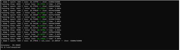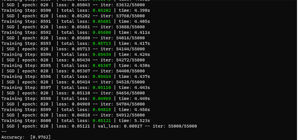 在上面的示例中,我们可以看到我们的精度率为 97.5%,这非常好。通过这种方式,我们可以通过更改优化器和损失函数来微调模型的精度。在这个示例中,我们看到了使用 Adam 优化器。