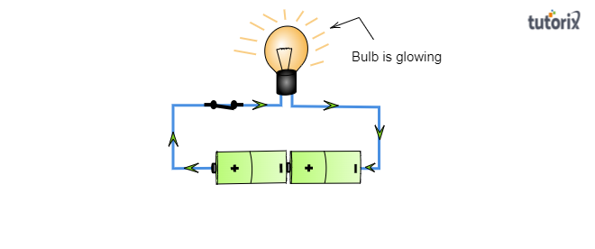 在此给定电路中,电池的正极连接到另一个电池的正极。为了使灯泡发光,我们应该将电池的正极连接到电池的负极,如下图所示。现在,电流将流过电路,灯泡将发光。