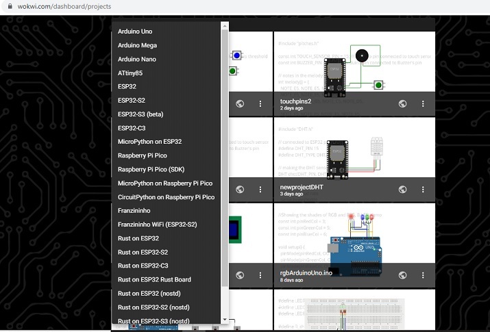图 1:从列表中为 Wokwi 上的物联网项目选择微控制器