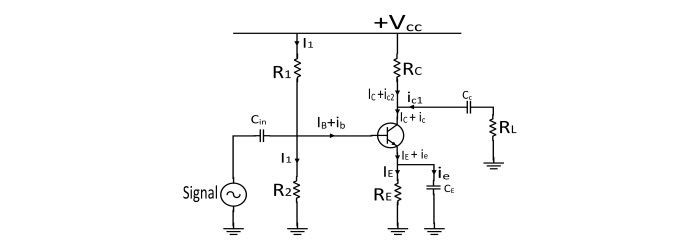 发射极旁路电容 (CE) - 此电容与 RE 并联使用,为放大的输出交流信号提供低阻抗路径。如果不使用此电容,放大的交流信号将流过 RE,并在其两端产生电压降,从而降低输出电压。