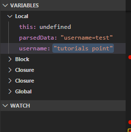 在左侧菜单中,我们还可以看到变量和表达式在监视中,例如: