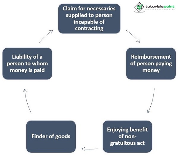 印度合同法第五章“某些类似于合同创造的关系”标题下涵盖了此类情况。第 68-72 条规定了五种准合同责任: