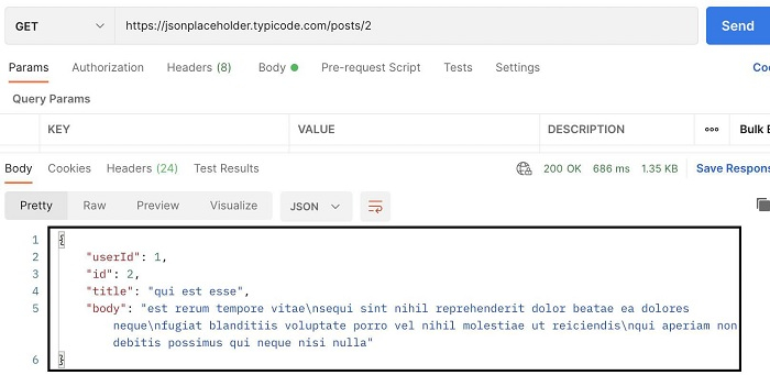 我们首先将通过 Postman 在端点上发送 GET 请求: https://jsonplaceholder.typicode.com/posts/2 并观察其响应。