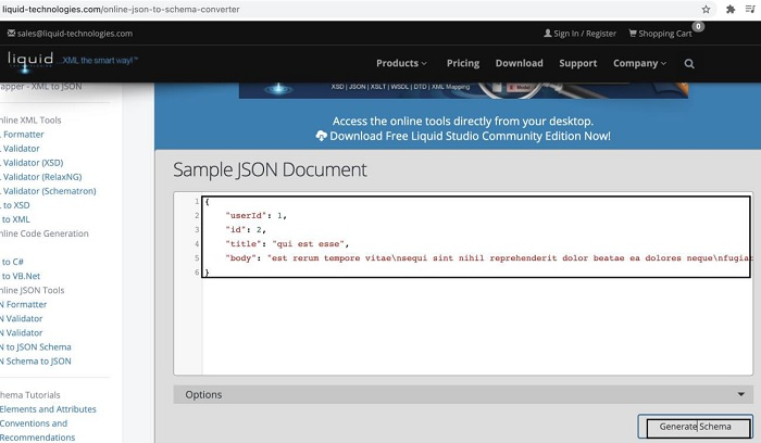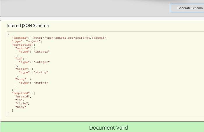通常,JSON 响应的 Schema 由开发人员提供。但是,我们也可以借助在线资源(链接如下)生成一个:https://www.liquid-technologies.com/online-json-to-schema-converter
