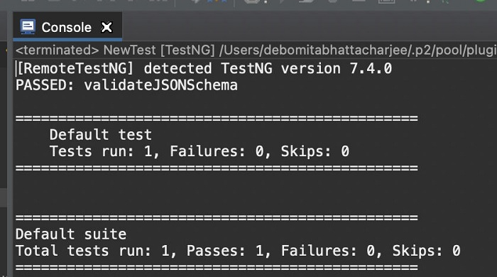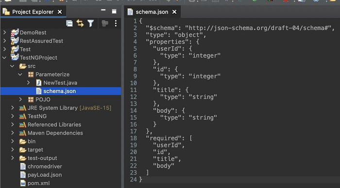 我们将使用 matchesJsonSchema 方法(JSONSchemaValidator 类的一部分)来验证 Schema。要使用 JSON Schema 验证,我们必须在 Maven 项目的 pom.xml 中添加额外的 JSON Schema 验证器依赖项 -