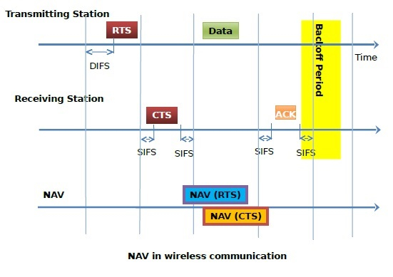 在虚拟信道感知中,使用了一种基于先前帧传输持续时间信息的定时器机制来预测信道中的未来流量。它使用网络分配向量(NAV),可以将其视为一个递减到零的计数器。