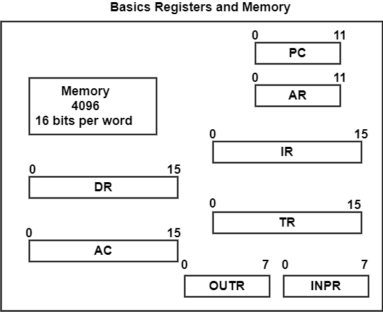- 输入寄存器 (INPR) 和输出寄存器 (OUTPR) 用于 I/O 操作。INPR 从输入设备接收 8 位字符。OUTPR 类似。