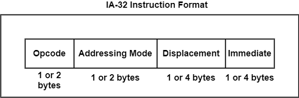 图中显示了通用的 IA-32(英特尔架构 - 32 位)指令格式。IA-32 是英特尔最优秀的微处理器可以使用的指令格式。此指令格式包含四个字段,例如操作码字段、寻址方式字段、位移字段和立即数字段。