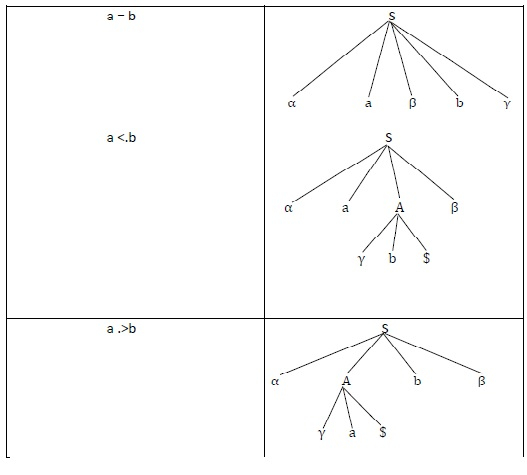 如果产生式的右边形式为 α a A β 且 A ⟹+ γb$,其中 γ 是 ε 或单个非终结符,则 a <.b。