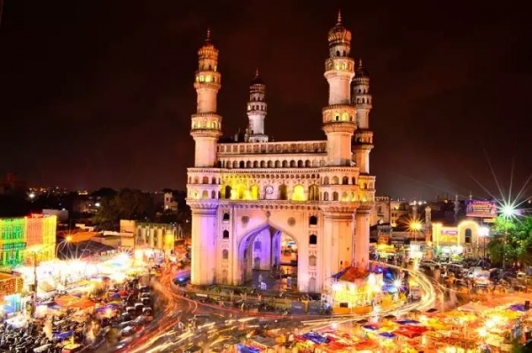 查尔米纳尔是海得拉巴市最主要的景点。晚上亮灯时,它看起来非常壮观。