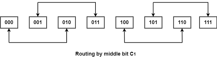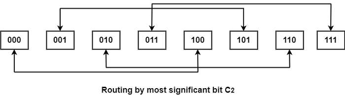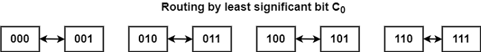 超立方体路由功能 - 三维立方体如下所示:路由功能由节点地址中的三个比特定义。比特顺序为C2C1C0。数据可以在最不重要的比特不同的相邻节点之间交换,如下所示。