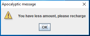 JOptionPane.showMessageDialog(frame, "You have less amount, please recharge","Apocalyptic message", JOptionPane.WARNING_MESSAGE);