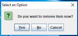int result = JOptionPane.showConfirmDialog(null, "Do you want to remove item now?");