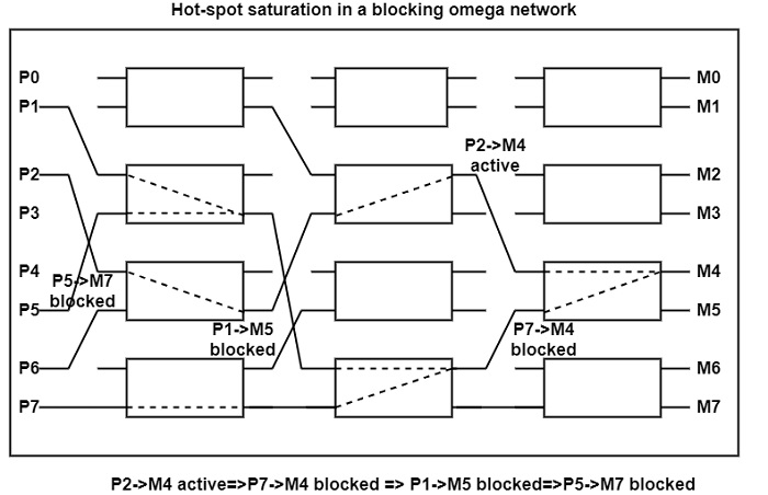在排队网络消息中,P7→M4被阻塞,因此阻止了消息P1→M5通过。这导致消息P5→M7被阻塞。这种情况表明,尝试访问不同内存模块的处理器会因热点而延迟。在非排队网络中,P5→M7消息没有障碍,因为P1→M5将被网络拒绝。