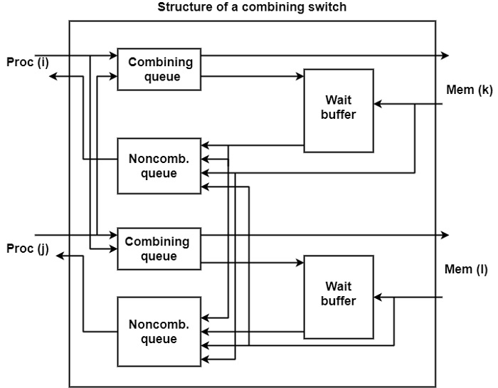 减少交换网络中热点影响的另一种方法是引入组合交换机。这些交换机识别出两个消息指向相同的内存模块,在这种情况下,它们可以将两个消息合并为一个。