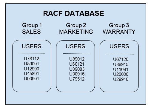 RACF 包含其自己的数据库,其中包含不同的 RACF 组。主机上的每个用户都将分配到一个 RACF 组。