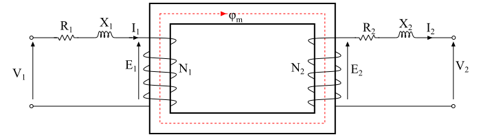 漏磁通路径主要通过具有非常高磁阻的空气。因此,原边漏磁通(ϕ1)的作用是在原边绕组与串联中引入一个电感性电抗(X1)。同样,副边漏磁通(ϕ)在副边绕组与串联中引入一个电感性电抗(X2)(见图)。