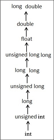 **通常算术转换** 会隐式地将操作数的值转换为公共类型。编译器首先执行整数提升;如果操作数的类型仍然不同,则将其转换为以下层次结构中出现的最高类型: