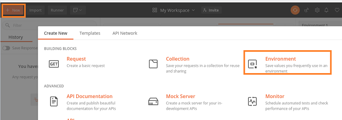 步骤 1 - 点击“新建”菜单,然后点击“环境”链接。