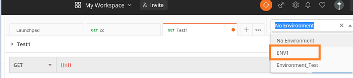 步骤 4 - 选择环境 ENV1,并在地址栏中添加 {{u}}。要在请求中使用环境变量,需要用双大括号 {{<环境变量名称>}} 将其括起来。