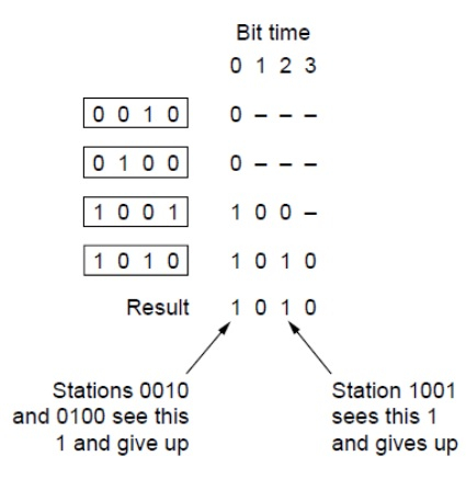 步骤 2 − 一个站点想要使用信道。它必须将其地址作为以高阶位开头的二进制位串广播出去。