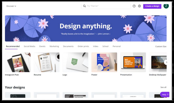 创建多种类型的内容——从引人注目的社交媒体帖子到信息图表和简历,Canva可以帮助您设计任何您需要的东西。您还可以从头开始创建自己的设计。