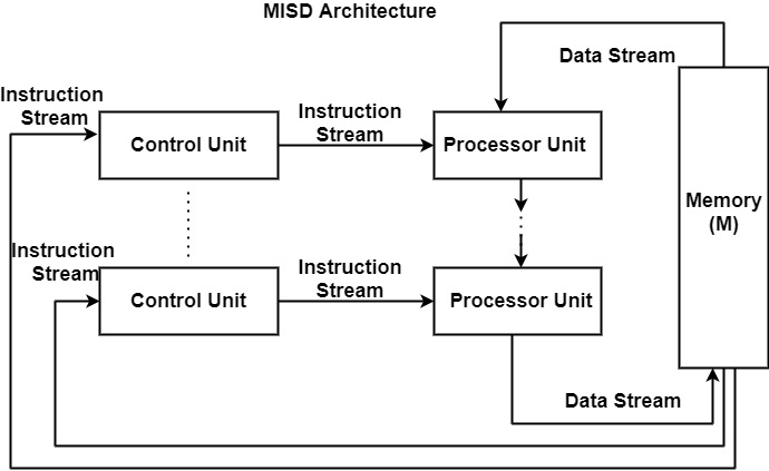 此组织包含 n 个处理单元,每个处理单元对相同的数据流执行不同的指令。这种结构很少受到关注,并且存在一些实际缺陷,有时它也被认为是不切实际的结构。