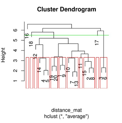 library(cluster) # Create a sample dataset set.seed(123) x <- matrix(rnorm(100), ncol = 5) # Finding distance matrix distance_mat <- dist(x, method = 'manhattan') distance_mat # Fitting Hierarchical Clustering Model # to the training dataset set.seed(240) # Setting seed Hierar_cl <- hclust(distance_mat, method = "average") Hierar_cl # Plotting dendrogram plot(Hierar_cl) # Choosing no. of clusters # Cutting tree by height abline(h = 5.5, col = "green") # Cutting tree by no. of clusters fit <- cutree(Hierar_cl, k = 3 ) fit table(fit) rect.hclust(Hierar_cl, k = 11, border = "red")