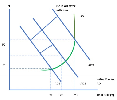 根据凯恩斯理论,产出的增加导致收入增加,进而导致消费增加。借助 MPC 的值,我们可以利用以下公式计算出我们需要使用多大的乘数:
