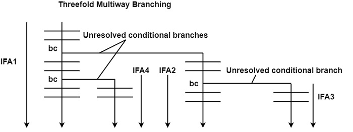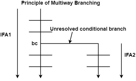 如图所示,它显示了三路多路分支。在这种情况下,四个指令获取地址同时维护(IFA1-IFA4)。其中只有一个与正确的路径相关。在所有条件分支都得到解决后,确定唯一的正确线程,并取消属于错误路径的所有计算。