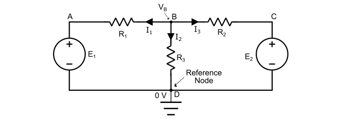 $$\mathrm{\frac{\mathit{V}_{B}\:-\mathit{E}_{1}}{\mathit{R}_{1}}+\frac{\mathit{V}_{B}\:-E_{2}}{\mathit{R}_{2}}+\frac{\mathit{V}_{B}}{\mathit{R}_{3}}=0}\:\:\:…(2)$$