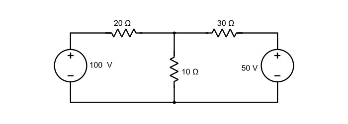$$\mathrm{\frac{\mathit{V}_{A}-100}{20}+\frac{\mathit{V}_{A}}{10}+\frac{\mathit{V}_{A}-50}{30}=0}$$