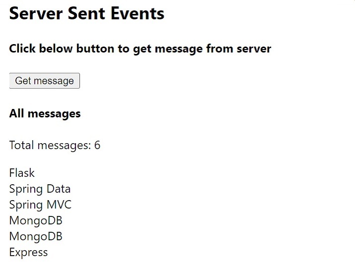 之后,当用户单击“获取消息”按钮时,它将向“message”端点发送一个 POST 请求,并附带特定消息。服务器接收消息并通过服务器发送事件将其发送回客户端。
