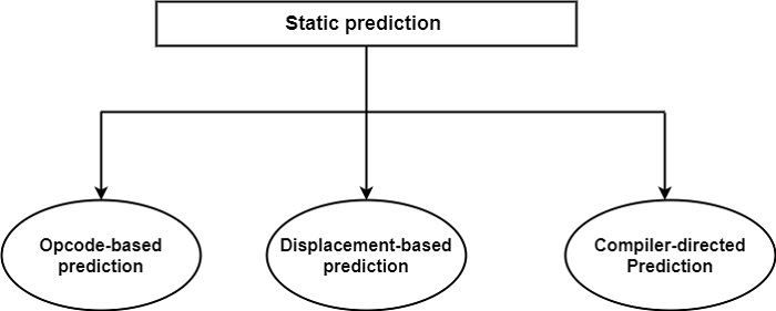 在**静态预测**技术中,分支采用“总是执行”或“从不执行”的方法。它可以通过调查目标代码的特定属性来进行静态预测。在实际实现中,静态预测要么基于操作码,要么基于位移,要么基于编译器提供的提示,如图所示。