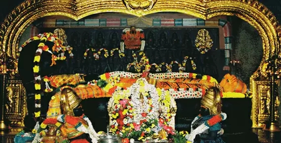 这尊神像长18英尺,可以通过三个门看到,这意味着头部和胸部通过第一个门,手臂通过第二个门,脚部通过第三个门。这种姿势被称为阿南塔萨亚纳姆,意思是瑜伽睡眠。斯里德维、布德维以及纳拉辛哈斯瓦米、甘帕蒂和加亚拉克什米的神像都位于这尊神像旁边。