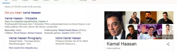 现在,你可以在卡玛·哈桑的名字下面看到“印度政治家”的字样。我不知道,但这让我大吃一惊。包括我在内的许多人都认为他首先是一位演员,然后才是政治家,因为他于2018年成立了自己的政党——**人民正义党**(Makkal Needhi Maiam),但我认为谷歌的观点有所不同。