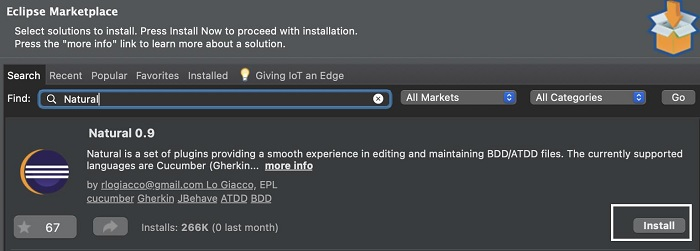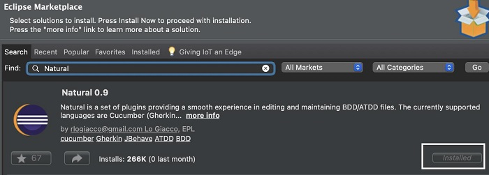 步骤 5 − 再次启动 Eclipse,然后点击帮助菜单,然后选择 Eclipse 市场。在查找字段中输入自然语言并点击前往。现在,自然语言插件将显示为己安装。