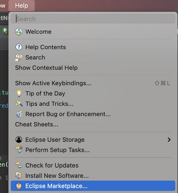 步骤 1 − 在 Eclipse 中点击帮助菜单,然后选择 Eclipse 市场