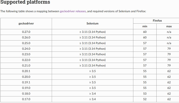 那里将列出所有与相应 Selenium 版本兼容的 geckodriver 版本。